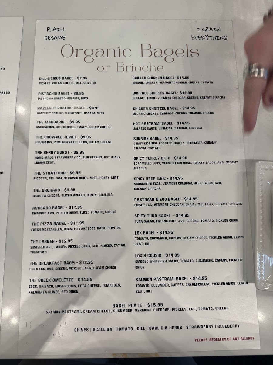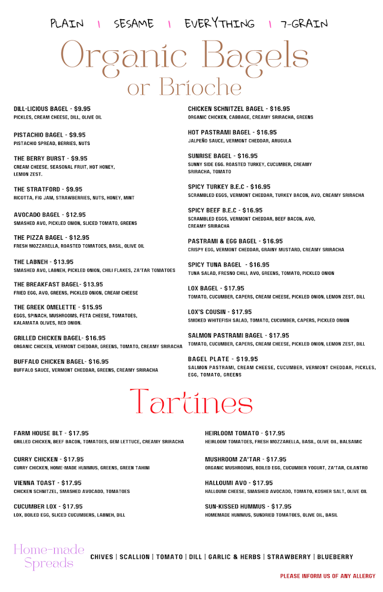 The menu features a variety of options divided into several main categories to suit different times of day and dining preferences. Guests can choose from a selection of organic bagels and brioche sandwiches, offering diverse toppings such as dill cream cheese, pistachio spread, seasonal fruits, and smashed avocado with fresh vegetables. These items provide convenient choices for breakfast or light meals.