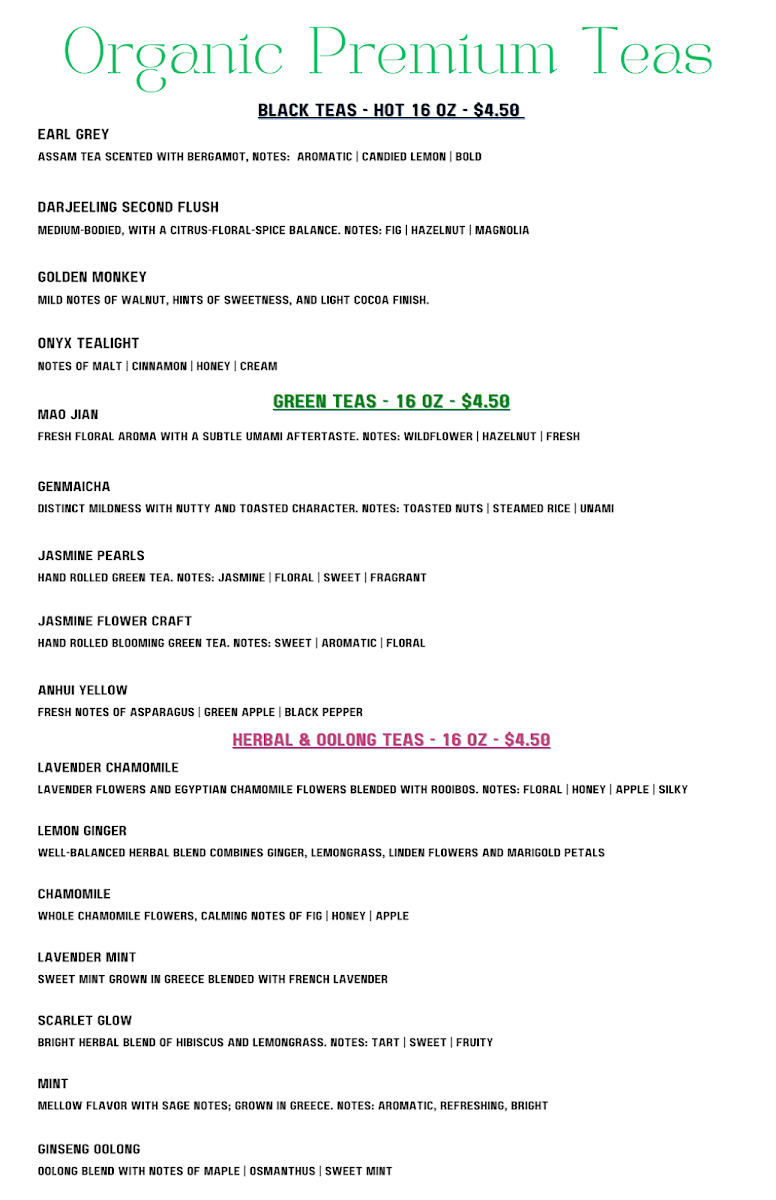 Beverage options focus on a range of herbal and oolong teas. Available varieties include blends such as Anhui Yellow, Lavender Chamomile, Lemon Ginger, and Chamomile, which provide different aromatic and flavor profiles to complement food selections or serve as a refreshing standalone choice.